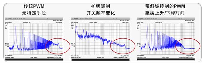 要滿足智能手機揚聲器放大器的這些期望性能要求,D類放大器是極佳選擇。如D類放大器提供極低EMI,避免與其它RF電路產生干擾。實際上,D類放大器將輸入的模擬音頻信號轉換為脈寬調制(PWM)的脈沖信號,再以此脈沖信號控制開關器件來導通/關閉音頻功率放大器。對于智能手機應用而言,要降低音頻輸出段的EMI,重要的是減少較高頻率的頻譜部分。傳統PWM技術沒有特定手段來應對。但要做到這一點,可以采用兩種技術,一是PWM擴頻調制(開關頻率變化),一是帶斜坡控制的PWM(延緩上升/下降時間)。相比較而言,斜坡控制技術比擴頻調制技術在減少較高頻率的頻譜方面更為有效,更有利于降低EMI。