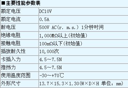 “CIM-J38N”連接器采用了小型、薄型設計,標準安裝型的物理尺寸為高1.30mm、寬13.7mm、進深15.3mm。連接器采用Push-in Push-out推擋方式,卡排出尺寸為3.8mm。同時還附帶防卡彈出止動結構、裝載卡檢測開關(Normally open型)、RFID接頭,并增強了卡反向插入功能。另外還增強了EMI對策用接地線(Ground)功能。