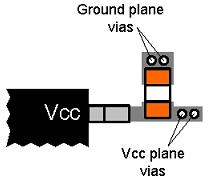 通過(guò)將電容的電源端直接連接至器件的電源端,然后經(jīng)過(guò)孔連至Vcc層,在器件上安裝小容量的0.1μF或0.01μF旁路電容。經(jīng)數(shù)個(gè)過(guò)孔將電容接地端連接至接地層(請(qǐng)參見圖6)。