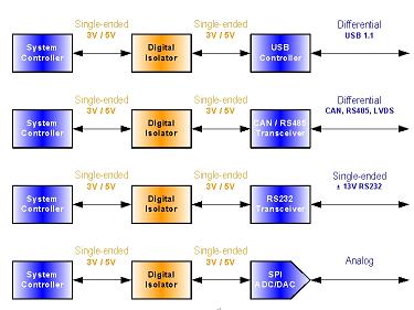 雖然最后一點(diǎn)似乎是設(shè)計(jì)上的限制,然而圖2卻顯示了如何對(duì)多種接口進(jìn)行隔離,其中包括低壓 SPI、高壓RS232、差分USB和差分CAN/RS485。