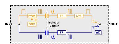 藍(lán)色部分所示路徑中處理的高速信號(hào)被電容式隔離勢(shì)壘分為多個(gè)快速瞬變脈沖群。隨后的觸發(fā)器(FF)將這些瞬態(tài)脈沖群轉(zhuǎn)換成波形和相位均與輸入信號(hào)一致的脈沖。內(nèi)部看門狗(WD)檢查高速信號(hào)邊緣的周期性。在低頻輸入信號(hào)情況下,連續(xù)信號(hào)邊緣間的持續(xù)時(shí)間超出了看門狗窗口。這樣便迫使看門狗將輸出開關(guān)位置從高速路徑(位置1)改變?yōu)榈退俾窂?位置2)。