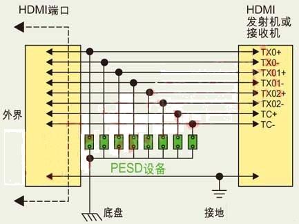 圖中展示了PESD器件對HDMI接口電路進行保護的典型應(yīng)用圖。