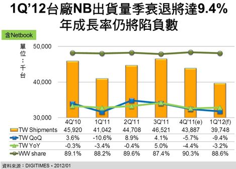 2012年第1季進入歐美傳統淡季,亞洲傳統旺季需求亦不甚熱絡,加上硬盤缺貨在1月最為嚴重,2月之后雖可逐月顯著改善,但英特爾(Intel)新CPU Ivy Bridge NB 4月上市在即,臺廠于3月即將開始大量出貨,致使1月硬盤未能滿足的舊CPU NB訂單將不具補單意義,進而造成臺廠NB出貨量將再較上季衰退9.4%。也由于全球景氣不振,NB市況持續低迷,DIGITIMES Research資深分析師兼主任簡佩萍預估,第1季臺廠NB出貨量將再較2011年同期衰退3.2%,致使連續兩年第1季臺廠NB出貨量年成長率均為負值。