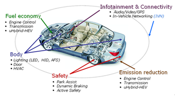隨著西方汽車市場需求的復蘇以及發展中經濟體車輛數目的持續增長使燃料消耗和污染不斷增加,政府和制造商都在積極探索改善燃油經濟性以節約能源、減少排放的途徑,汽車中越來越多的電子功能也使半導體元件在車輛中的比重不斷激增。面對環保和豐富消費者體驗的雙重挑戰,半導體制造商正在利用其技術專長開發各種符合汽車規范的解決方案。