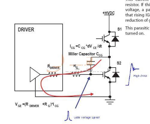 那么在來看看為何400V加上去,就會在下管上的G級上產生尖峰。借花獻佛,抓個圖片來說明: