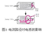 由鄰近效應(yīng)原理可知,某一導(dǎo)體的高頻電流在鄰近的導(dǎo)體層會(huì)形成輻射干擾電流。對(duì)于雙層銅排,當(dāng)電流源路徑與地平面互相疊層并使間距滿足絕緣層厚度遠(yuǎn)小于母排寬度時(shí),高頻電流將主要分布在兩塊銅排相臨近的兩個(gè)內(nèi)部平面上,部分高頻磁場(chǎng)可以相互抵消,相當(dāng)于等效減小了回路電感。疊層母線排與平行母線排電感大小比較如圖2所示。