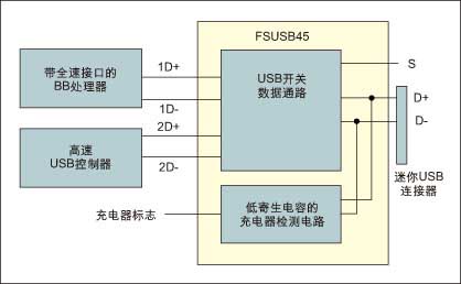 圖2:帶充電器檢測功能的USB開關非常適合高速USB應用,其USB電源和數據端口是共享的。