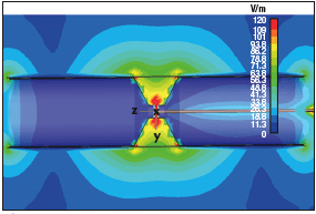 雙錐型天線被設(shè)計(jì)用來(lái)在大頻率范圍內(nèi)有效地工作。這種天線產(chǎn)生線性極化信號(hào)同時(shí)表現(xiàn)出極低的方位角波動(dòng),這意味著其多方向特征優(yōu)秀。這種結(jié)構(gòu)的有效帶寬處于兩倍頻程間,取決于可以容忍的輸入反射損耗。輸入反射損耗的影響受此結(jié)構(gòu)小型化程度決定,小型化的原因是選擇了圓錐到圓柱的傳輸區(qū)間,或完全使用圓錐區(qū)間。圖8和圖9分別給出了某雙錐天線及其電磁仿真結(jié)果。圖10給出了其測(cè)試性能,可以清晰地看到其方向角圖樣波動(dòng)非常小。雖然在商業(yè)通信系統(tǒng)中,這些構(gòu)造的高功率處理能力并不總是很重要,但小巧的尺寸卻使其充滿吸引力。例如一種能覆蓋整個(gè)從800MHz到2.2GHz頻段的產(chǎn)品可以封裝在一個(gè)直徑32mm,長(zhǎng)225mm的結(jié)構(gòu)中。雖然可以獲得更寬的帶寬,但必須在帶寬和直徑上折中選擇。較大的直徑會(huì)展寬天線工作頻率。這些天線構(gòu)造在非常寬的頻率范圍內(nèi)保持了其輻射圖樣特性,使它們適合微小區(qū)和微微小區(qū)的應(yīng)用。這樣的小區(qū)中使用天線放大信號(hào)(例如火車站)。擁有這種輻射圖樣的天線對(duì)于星形天線配置最有效。