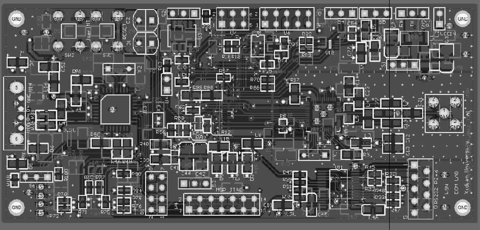 電路板根據不同的標準有不同的分類,在設計中大多數根據板的數目分類,在電氣連接關系復雜的電路板設計中,雙面板難以滿足電路布線的要求,這時就必須考慮使用多層板。本節點采用4層板,頂層主要是USB模塊和無線模塊,底層為微處理器模塊,內部層為電源層和地層。設計結果如圖7所示。