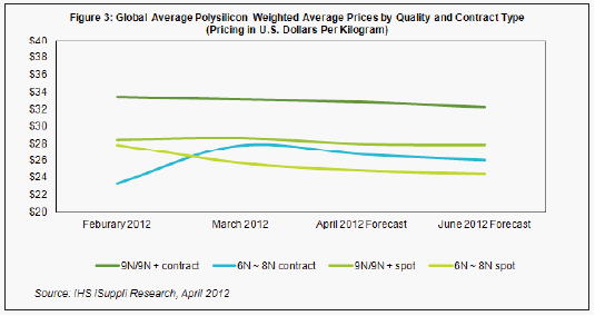 IHS iSuppli公司的多晶硅價格指數(shù)預(yù)示,未來幾個月,現(xiàn)貨市場和合同談判中的多晶硅價格都將下跌。但I(xiàn)HS iSuppli公司的研究顯示,多晶硅的價格可能發(fā)生變化,這不僅合同類型,而且取決于純度、供應(yīng)商所在位置和合同條款。例如,6月份9N/9N+純度的多晶硅合約價格預(yù)計會從2月時的33.40美元降至32.20美元。同時,6月份9N/9N+純度的多晶硅現(xiàn)貨價格預(yù)計從2月時的27.90美元降到24.40美元,如圖2所示。[member]