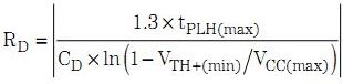 當總線電壓變為正(VBus > 200 mV)時,RX1 輸出變為高,其驅動 DR2 輸出為高,并通過 RD 對 CD 緩慢充電。必須正確計算最小時間常量(RD × CD),以使最大電源電壓 VCC(max) 和最小正反相器輸入閾值VTH+(min) 時,延遲時間tD 超過驅動器最大低到高傳播延遲 tPLH(max),即超出 30%。例如,電容為 CD = 100 Pf 時,RD 的要求電阻值為: