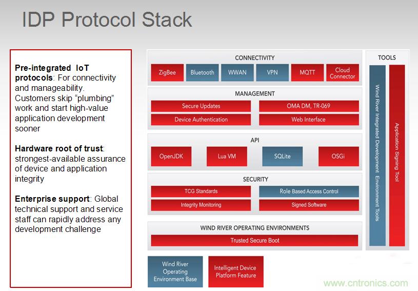 當下物聯網面臨了三大挑戰:連接、安全以及管理(數據的管理與分析),此外還存在新舊設備交替的過渡期,而Gateway是讓傳統設備實現聯網的最佳方式(如電表),蘇建豪如是說。風河在Gateway中提供了IDP,是一個物聯網平臺,廠商可以在上面自己做開發,而不需要再下功夫去考慮連接、安全等問題,有效節省開發時間。