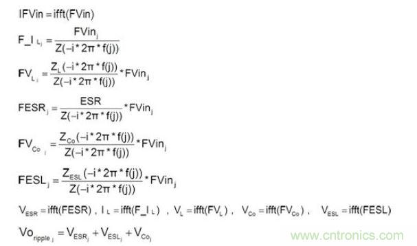 一般而言,在穩態(Steady State)及負載固定時,輸出電容的紋波電壓主要是由電感的紋波電流造成,可先計算出電感的紋波電流,再利用歐姆定律,電感微分公式及電容電荷儲存公式,分別計算出ESR、ESL及Capacitance的紋波電壓。再將此三種紋波加總起來,便可得輸出電容的紋波電壓,如公式1所示: