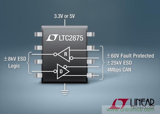 CAN 總線系統在工業控制、儀表網絡和汽車電子等產品中變得越來越受歡迎。CAN 總線具備良好定義的協議棧,支持獨立控制器、FPGA 和 ASIC,從而比其他接口更易于部署。LTC2875 可由 3.3V 或 5V 電壓軌供電,這種靈活性對于可能沒有 5V 電壓軌的工業應用是非常必要的。除了擁有很強的故障保護和 ESD 保護,該器件還具有低電磁輻射 (EME) 驅動器和一個發送數據 (TXD) 主導的定時器,以防止發生故障的控制器箝位總線;該器件同時提供一個高抗電磁干擾 (EMI) 的接收器和一個擴展的 ±36V 共模范圍,以能夠在電氣噪聲的環境和存在接地環路時工作。LTC2875 提供 4Mbps 的高速數據速率和一個可調擺率以實現低至 1kbps 的數據速率。停機模式時,LTC2875 的所有輸出均為高阻抗狀態,并且功耗降至 1µA。