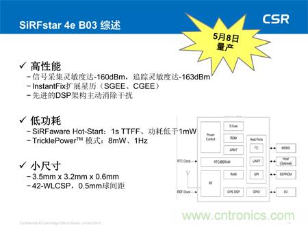 【導(dǎo)讀】幾日前,小編有幸參加了CSR公司在深圳舉辦的定位開發(fā)者大會。在會議上,CSR公司定位產(chǎn)品事業(yè)部高級總監(jiān)Dave Borison 以及CSR大中華區(qū)銷售副總裁鄭元更先生詳細的介紹了CSR公司最新的產(chǎn)品SiRFstar 5e B02。全面了解了SiRFstar 5e B02在定位上取得的全新的突破性進展,下面請看詳細內(nèi)容。