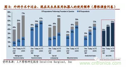 雖然當前醫用機器人普及率還很低,并且安裝的大部分是發達國家,但摩根的近期的一個調查研究中問及外科醫生們未來他們會在自己在手術中多高頻率的使用醫用機器人,數據表明美國的外科醫生們認為未來3-5年里醫用機器人在手術中的使用率會迅速上升到一個比較高的層次,約占50%,醫用機器人市場潛力巨大。IFR預測在未來的4年里,醫療機器會以每年19%的速度增長,2016年全球市場規模估計會增長到119億美元。