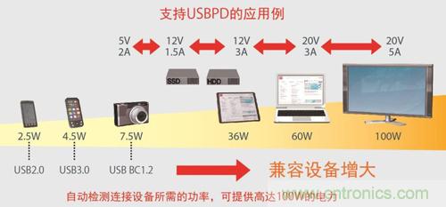 在這方面ROHM公司先行一步,近日ROHM公司宣布,推出支持在USB Type-C接口中實現USB Power Delivery(以下稱USBPD)功能的供受電控制器IC——BM92TxxMWV系列,該器件可實現高達100W(20V / 5A)的供受電,而以往的USB Type-C接口的供受電能力僅為7.5W。BM92TxxMWV系列IC的推出,使得筆記本電腦和TV等需要較大功率的設備,也可通過USB端子供電來驅動;同時,在智能手機和平板電腦等USB端子的傳統用途中,還可實現比以往高約4倍以上的快速充電。