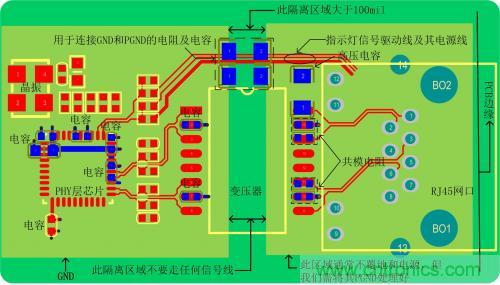 e)變壓器的兩邊需要割地:即RJ45連接座和變壓器的次級線圈用單獨的隔離地,隔離區域100mil以上,且在這個隔離區域下沒有電源和地層存在。這樣做分割處理,就是為了達到初、次級的隔離,控制源端的干擾通過參考平面耦合到次級;
