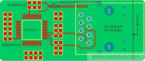 1.圖 2網口變壓器沒有集成在網口連接器里的參考電路PCB布局、布線圖,下面就以圖 2介紹以太網電路的布局、布線需注意的要點。