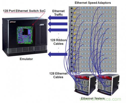 今天,以太網交換機和路由器已達到 256 個端口(到年底將會增加到 1024 個端口),而且它們可處理高達 120 Gb/s 的流量。同時,網絡交換的延遲也在持續下降中,最低延遲已降至 1 µs。所有這些因素促使如今的網絡交換機和路由器芯片成為有史以來最大規模的芯片,達到了五億門級。在流片完成之前驗證此類復雜 IC 設計是一項難以完成的任務。我們來考慮下具有 128 端口以太網接口的 SoC 設計。