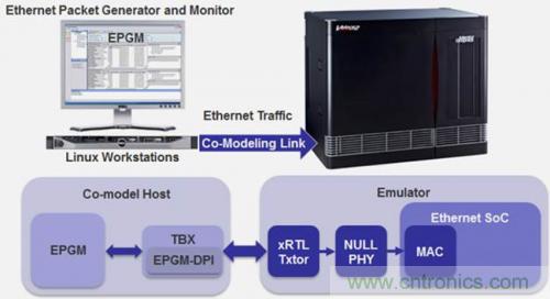 在此場景中,以太網測試儀模型運行于連接到硬件仿真器的Linux工作站上?;诔墒斓膶崿F IP,模型準確再現了實際的物理測試儀。這種虛擬測試儀包括以太網數據包生成器和監視器 (EPGM),可以為 1G、10G、40G/100G 和 120G 網絡分別配置 GMII、XGMII、XLGMII/CGMII 和 CXGMII 接口。每個支持的MII端口都需要一個 xRTL 事務處理器(圖 2)。