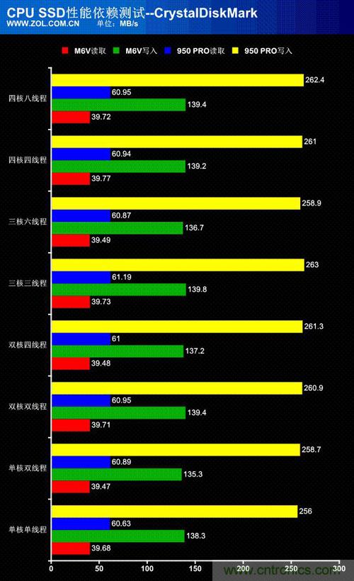 接下來的CrystalDiskMark測試,SSD的性能表現同樣和AS SSD Benchmark相似,CPU核心數量和線程數量的增加并未對SSD的讀寫性能造成影響。