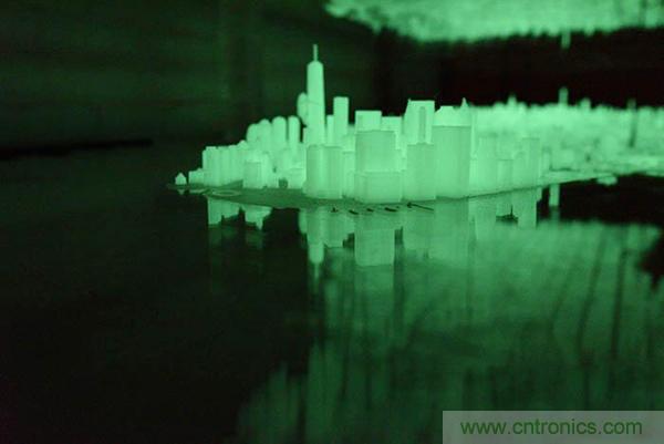 這些城市街區是用3ds Max和Rhino軟件設計之后,再用能夠在黑暗中發光的半透明線材3D打印的。這其中的每個模型都經過了精心設計使之盡可能地與真實保持一致。除此之外,Huang還會偶爾在個別細部的地方秀一下自己的幽默感,比如他就3D打印了一個金剛并將其放到了自由塔上。