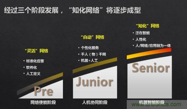 階段一:網絡使能階段。 網絡進行軟硬解耦,物理網絡向高維度的軟件化發展,實現一個更靈活的網絡。這時網絡通過SDN、NFV等技術,屏蔽底層硬件的差異,實現網絡的扁平化和集中配置,主要能實現標準化的應答服務。網絡將實現人工軟件定義,更強的可管可控。
