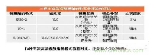我們下面來看看主流的3種編碼格式,包括Mpeg2、VC-1、H.264的解碼流程對比(見下圖)。可以看出,幾種編碼格式還是有不少區別的,這也是造成幾種編碼格式要求不同的原因,H.264編碼格式最為復雜,因此系統要求最高,VC-1略有降低,但是也比Mpeg2高得多。