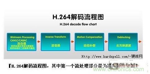 那么究竟高清編碼的步驟有哪些,哪些又是負載最高的部分呢?以H.264視頻舉例而言,分為四個主要部分(見下圖)。圖中的四個方塊基本就是H.264解碼的四個最主要步驟,也是資源消耗的主要四個部分,其中又以第一步的“CAVLC/CABAC解碼”最為消耗運算資源,這方面遠高于其他三步(簡單的說,CAVLC/CABAC是H.264編碼規范中兩種不同的算法,際俏了提高壓縮比,其中CABAC比CAVLC壓縮率更高,但解碼時自然也要求更高)。