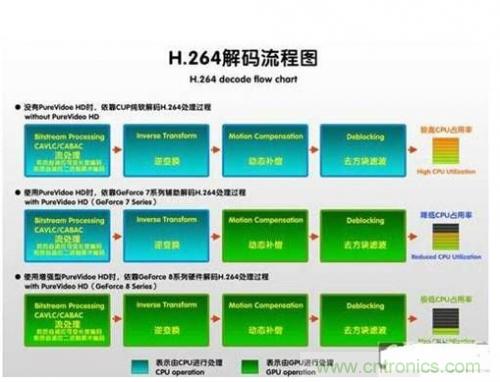 下圖H.264的解碼過程很好的說明了問題。如果顯卡不承擔任何步驟(圖解第一行),那么CPU占用率很高,甚至根本無法流暢播放;如果顯卡能實現后兩個步驟的解碼處理(圖解第二行),CPU可以獲得部分解放,但是對于比較關鍵的、負載最大的“流處理”,部分顯卡還不能實現,所以CPU占用率有所下降,但是仍然偏高。