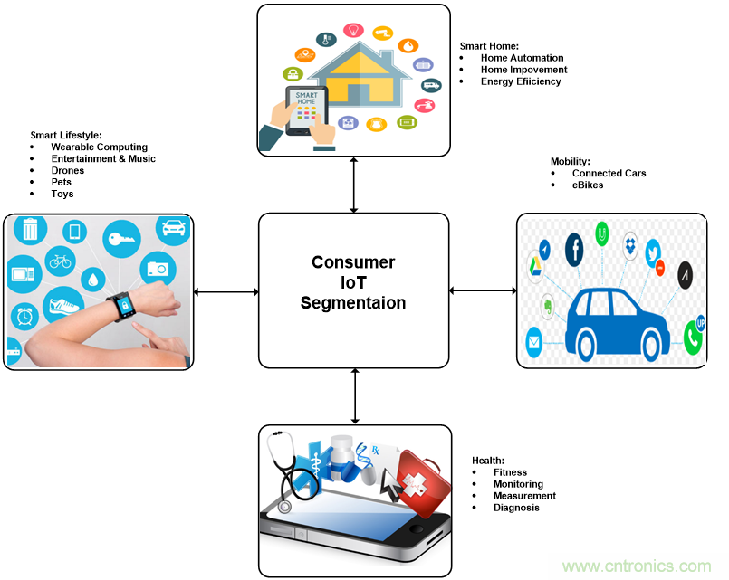 消費型物聯網包括住宅、生活方式、健康和出行。個人用戶可以通過這些物聯網設備產品提高其生產力、安全性和生活質量。從智能住宅到聯網汽車,消費者市場正在為下一波浪潮做好準備。