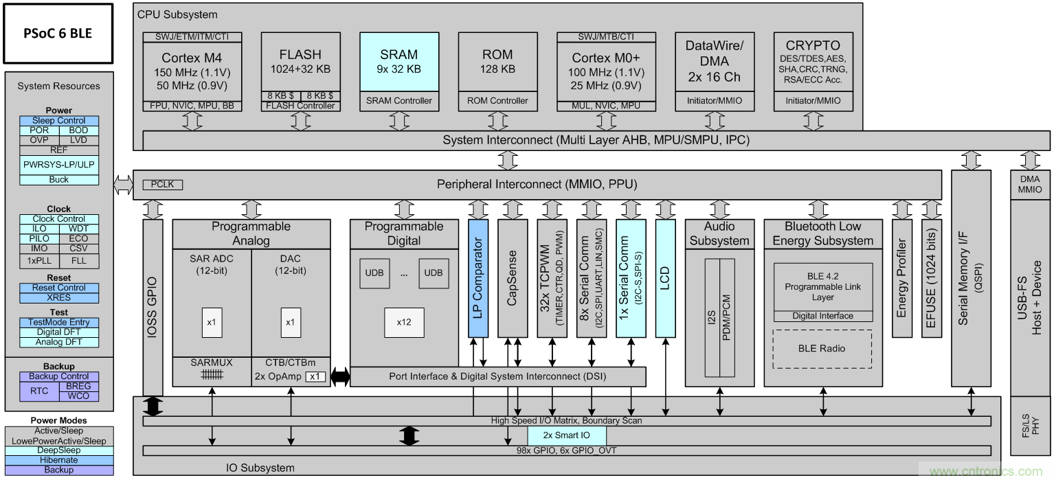 例如,用于制造賽普拉斯半導體 PSoC 6 BLE 系列 MCU 的 40 納米工藝技術,為各種物聯網應用提供了高性能,且高效節能的解決方案。深度睡眠時的電流僅為幾微安,且能夠完全保留RAM數據。運行、睡眠、低功耗運行和低功耗睡眠等其他功耗模式,助力開發人員能夠在靈活地優化系統功耗的同時根據需求保持應用的高性能。