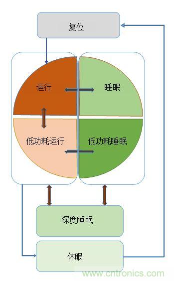 在考慮 MCU 的功耗模式時,超越其基本架構十分重要。例如,標準 ARM CPU 內核支持運行、睡眠和深度睡眠。附加功耗模式通常由特定的 MCU 供應商添加。例如,賽普拉斯的 PSoC 6 BLE MCU可執行包括,低功耗運行、低功耗睡眠和休眠狀態在內的六種工作功耗模式。