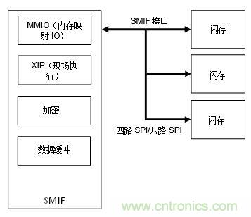 SMIF 允許用戶配置多個相同或不同類型和大小的存儲設備。在內存(XIP)模式下,多個內存設備被映射到不同的地址。它們可以是不同類型和用途的存儲器,也可以是在連續地址空間中配置以模擬連續大存儲器的相同存儲器設備。SMIF 外設和 SPI 閃存的組合使用可以替代外部 NAND 和 NOR 閃存,并且可以節省電路板空間。由于串行閃存直接映射到處理器的內存空間數據存儲中并且支持 XIP 的執行,所以其易用性高于 NAND 內存。