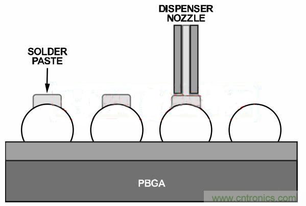 某些情況下,利用模板將焊膏均勻精確地涂敷在PCB焊盤上可能不可行,尤其是對于器件密度高或幾何空間緊張的電路板。這種情況下,應考慮將焊膏涂敷在器件底部的焊球上。為此,可利用模板將焊膏涂敷在焊球上端,或將焊膏分配給所有焊球(參見圖8和圖9)。可利用專門設計的夾具和/或返修設備來達到這一目的。