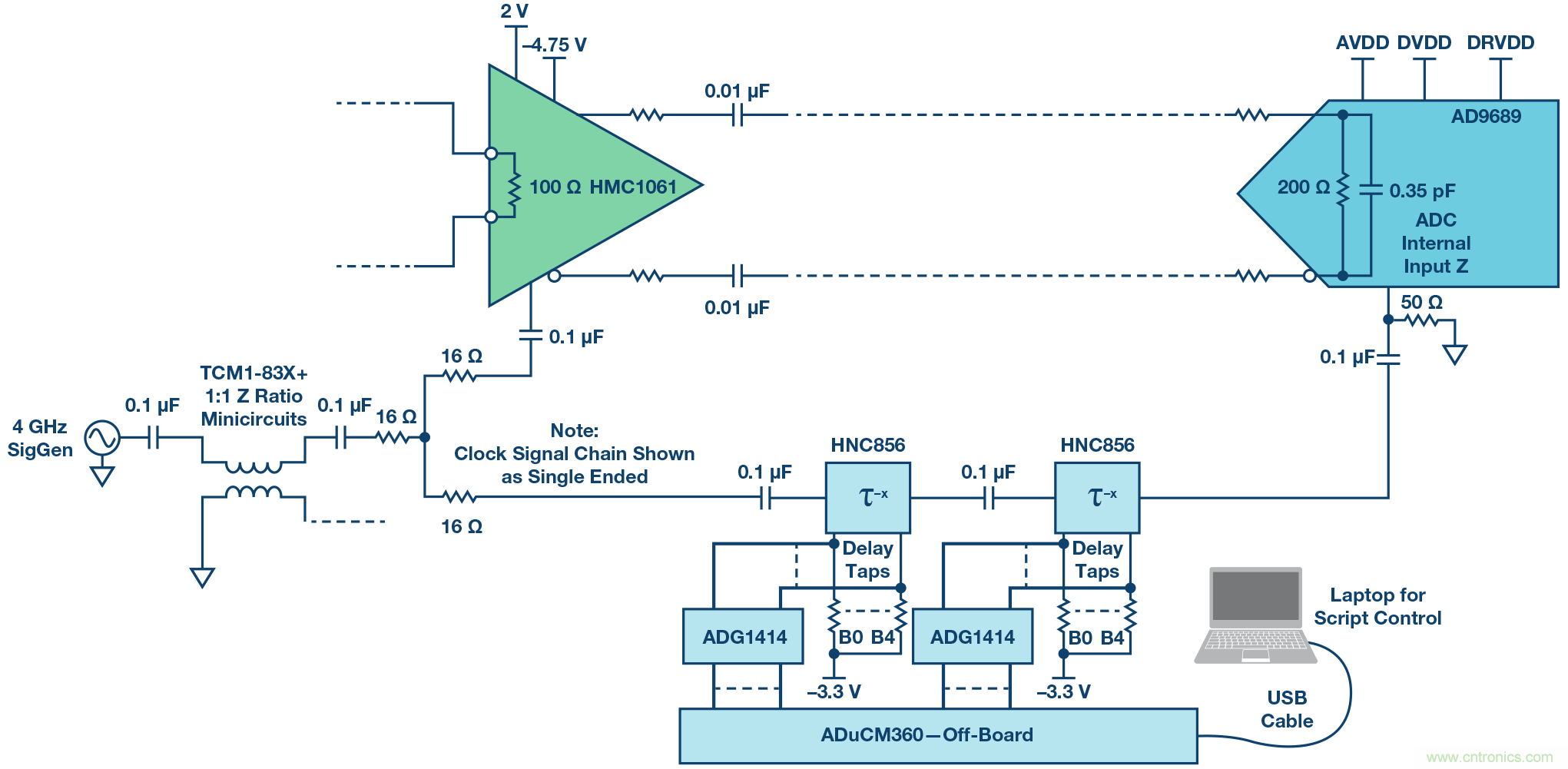 在電路板上完成該過程可能冗長乏味,因為紙面分析可能不會考慮PCB板上時鐘走線傳播間隔造成的相應延遲,內部器件組延遲,ADC孔徑延遲,以及將時鐘分為兩個不同段所涉及到的相關電路(一條時鐘走線用于THA,另一條時鐘走線用于ADC)。設置THA和ADC之間延遲的一種方法是使用可變延遲線。這些器件可以是有源或無源的,目的是正確對準THA采樣過程的時間并將其交給ADC進行采樣。這保證了ADC對THA輸出波形的穩定保持模式部分進行采樣,從而準確表示輸入信號。