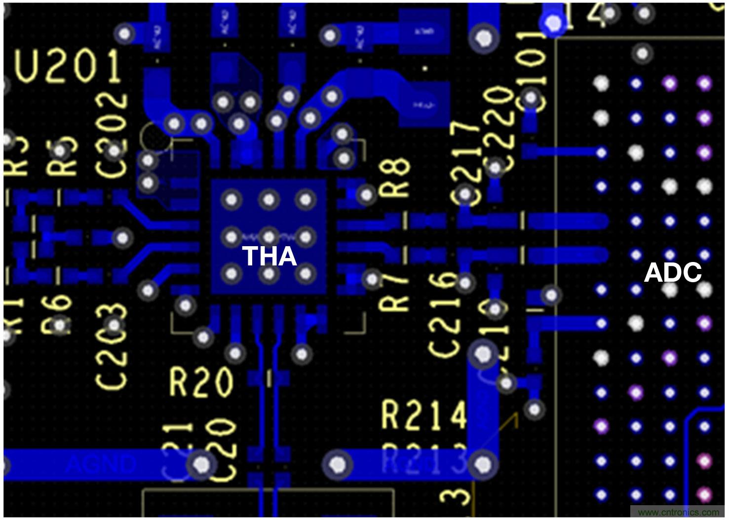 信號通過差分模式連接到THA輸入(我們同時是也提供單端射頻信號輸入的參考設計鏈路),形成單一前端網絡。為了最大限度地減少過孔數量和總長度,我們在這里特別小心,讓過孔不經過這兩條模擬輸入路徑,并且幫助抵消走線連接中的任何線腳。