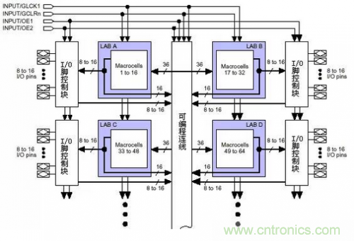 我們先看一下這種PLD的總體結構(以MAX7000為例,其他型號的結構與此都非常相似):