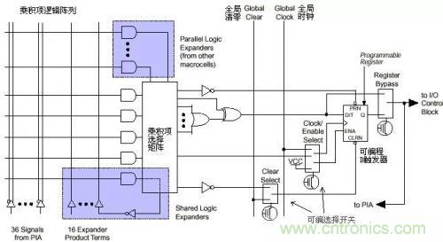 左側是乘積項陣列,實際就是一個與或陣列,每一個交叉點都是一個可編程 熔絲,如果導通就是實現“與”邏輯。后面的乘積項選擇矩陣是一個“或”陣列。兩者一起完成組合邏輯。圖右側是一個可編程D觸發器,它的時鐘,清零輸入都可 以編程選擇,可以使用專用的全局清零和全局時鐘,也可以使用內部邏輯(乘積項陣列)產生的時鐘和清零。如果不需要觸發器,也可以將此觸發器旁路,信號直接 輸給PIA或輸出到I/O腳。
