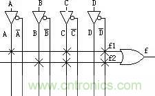 PLD將以下面的方式來實現組合邏輯f:
