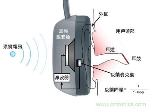 反饋降噪耳機(jī)(圖5)的工作原理主要是檢測(cè)耳鼓區(qū)域的噪聲,然后形成一個(gè)基本的反饋回路,以便最大限度地降低該區(qū)域的噪聲級(jí)。