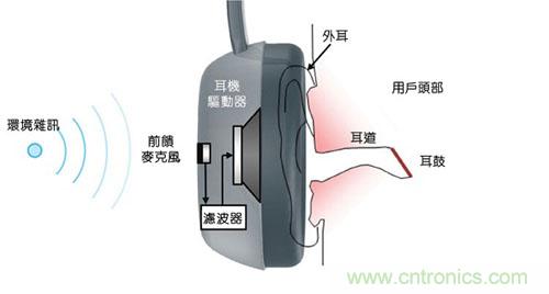 麥克風(fēng)偵測(cè)噪聲并透過(guò)濾波電路產(chǎn)生反相訊號(hào),在耳鼓處反相訊號(hào)與噪聲訊號(hào)抵消,從而降低人耳聽(tīng)到的噪聲級(jí)。這里的濾波電路主要用來(lái)補(bǔ)償耳鼓和麥克風(fēng)處偵測(cè)到的噪聲之間差異,另外對(duì)于喇叭本身在降噪訊號(hào)的響應(yīng)能力方面也有補(bǔ)償作用。