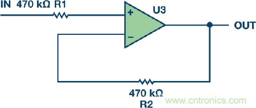 電阻熱噪聲的計算公式為√4kTRB,故1 kΩ電阻會有4 nV/√Hz的噪聲。增加電阻會增加噪聲。在圖2中,出人意料的是,雖然909 Ω補償電阻是值最低的電阻,但由于從該節點到輸出端的噪聲增益,它給圖2輸出端貢獻的噪聲最多。R1引起的輸出噪聲為40 nV/√Hz,R2為12.6 nV/√Hz,R3為42 nV/√Hz。因此,請勿使用電阻。另一方面,如果運算放大器采用雙電源供電,并且一個電源先于另一個電源上電,那么ESD網絡可能發生閂鎖問題。這種情況下,可能希望增加一定的電阻來保護器件。但若使用的話,應在電阻上放置一個旁路電容以減少電阻的噪聲貢獻。