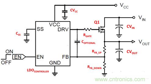 【導讀】在亞洲生活和工作讓我遇到了很多有趣的支持問題。例如,最近有人問我TI有沒有針對低壓降控制器的跨設備。該控制器位于小外形晶體管(SOT)-236封裝內,該封裝在印刷電路板(PCB)上所占面積為3mm×3mm。圖1所示為所推薦的控制器原理圖。