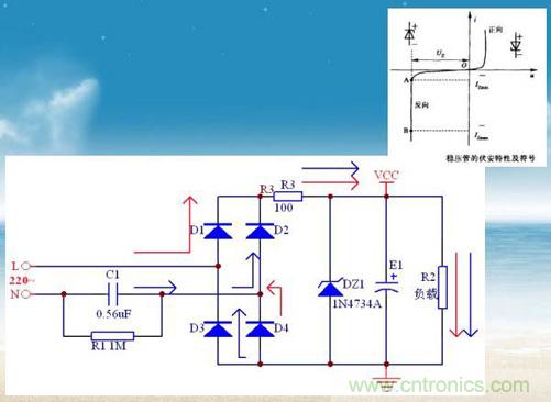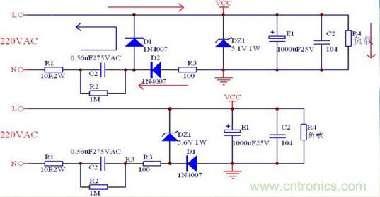R1:限流電阻,此電阻主要是防止首次上電和在快速插拔電源插頭或插頭接觸不良時所產生的高壓沖擊對整流二極管的損壞。電容C2在首次上電如果剛好碰在波峰處,因C2在通電瞬間呈短路狀態(一階零狀態響應),此時交流電源直接加在R1和整流管上,R1上有220VAC*1.414=311VDC瞬間直流電壓,如果上電時C1電荷未放完,此電壓可能會更高 。所以R1要選擇耐電流沖擊強和耐高壓的電阻,R1電阻不能太小,也不能太大,電阻太小沖擊電流大,電阻太大整個電路功耗增大。整流二極管的峰值電流一般會比較大,如1N400X系列峰值電流為50A,所以一般取R1電阻在10-50Ω之間。