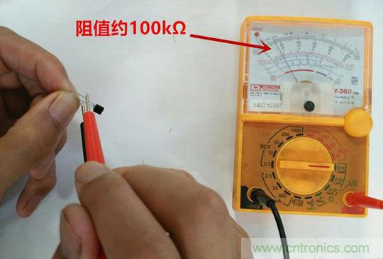 2.然后用拇指和食指捏住基極和另一個腳(假定該腳為集電極),方法同上,記錄顯示值R2;