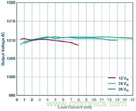 有關 LT8304-1 周圍組件所承受之電壓和電流應力計算的說明,詳見 LT8304-1 的數據手冊。值得注意的是,這款 1000 V 解決方案采用了一個在副邊具有 3 個分離輸出繞組的變壓器。原邊至副邊匝數比為 1:10:10:10,而不是單副邊繞組 1:30 匝數比變壓器。1:10:10:10 變壓器使得輸出電壓應力可在 3 個高電壓輸出二極管和 3 個高電壓輸出電容器之間分擔。單個組件的電壓額定值只需為總電壓的 1/3,因而有利于獲得更多可供選擇的輸出二極管和輸出電容器。圖 2 顯示這款峰值效率達到 90.5% 的反激式轉換器。即使未采用光耦合器,各種不同輸入電壓下的負載調節仍然很緊,精度通常為 2% 至 3%,如圖 3 所示。