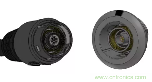 這個標準的高密度(79PIN)連接器有一個外徑為45毫米的金屬外殼、一個螺紋、鎖緊聯接螺母、一個防水密封圈和1.6mm的爬電/間隙尺寸。它的額定溫度為175℃,循環使用壽命高。在評估這一標準連接器時,設計者應該考慮這種非被動螺釘聯軸器是否是適用于特定應用的正確的鎖定機構。