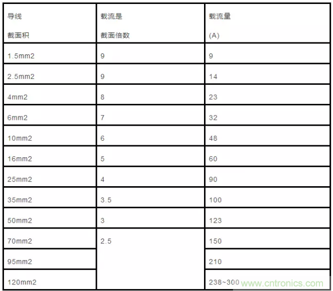 導(dǎo)線的截面積所能正常通過的電流可根據(jù)其所需要導(dǎo)通的電流總數(shù)進(jìn)行選擇,一般可按照如下順口溜進(jìn)行確定: